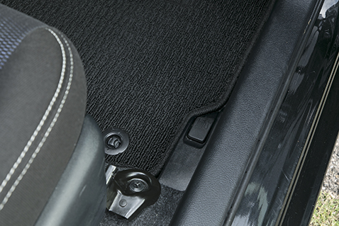 油箱蓋拉桿位於方向盤的右腳下方。可能會因為租車公司等因素,造成該拉桿被腳踏墊遮住。
