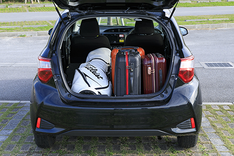 將後排座椅的單側放倒時,最多可放入2個高爾夫球桿袋,3個S號的行李箱。(M號的話只能收納1個)此時的乘車人數上限為3人。